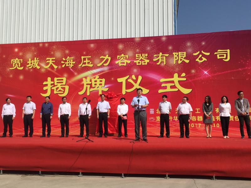 5月10号,宽城天海压力容器有限公司举行揭牌仪式。揭牌仪式由宽城县县长杨海龙主持,控股公司总经理王国华,副总经理王军和宽城县委书记祁海东等宽城县四大领导班子主要领导出席了揭牌仪式。